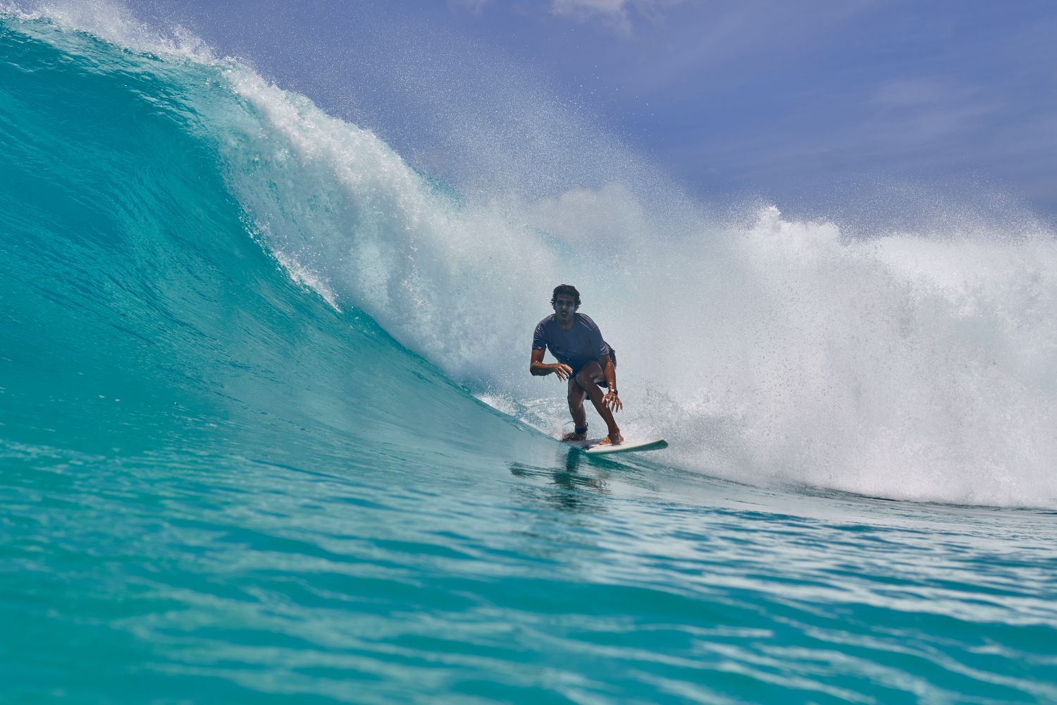 Machine (Maahbaidhoo; Tsunamis): en la punta norte de la isla de Mahibadhoo, esta derecha arranca en el arrecife exterior y va envolviendo hasta entrar en el canal. Se puede surfear con swell más pequeño y con cualquier marea, pero está en su mejor momento con un swell más grande del suroeste, marea subiendo y viento del suroeste. Con esas condiciones, se convierte en un tubo larguísimo y serpenteante: empieza fuera con una sección rápida y recta sobre el arrecife, luego entra en una esquina más suave y divertida, y termina con una última sección de tubo pesada y potente. Un clásico Pero esta ola exige remar fuerte: para llegar al take-off, para salir al final y para pelear contra la corriente al volver a la posición. También puede pasarte factura contra el arrecife. Requiere fuerza y buen nivel técnico.