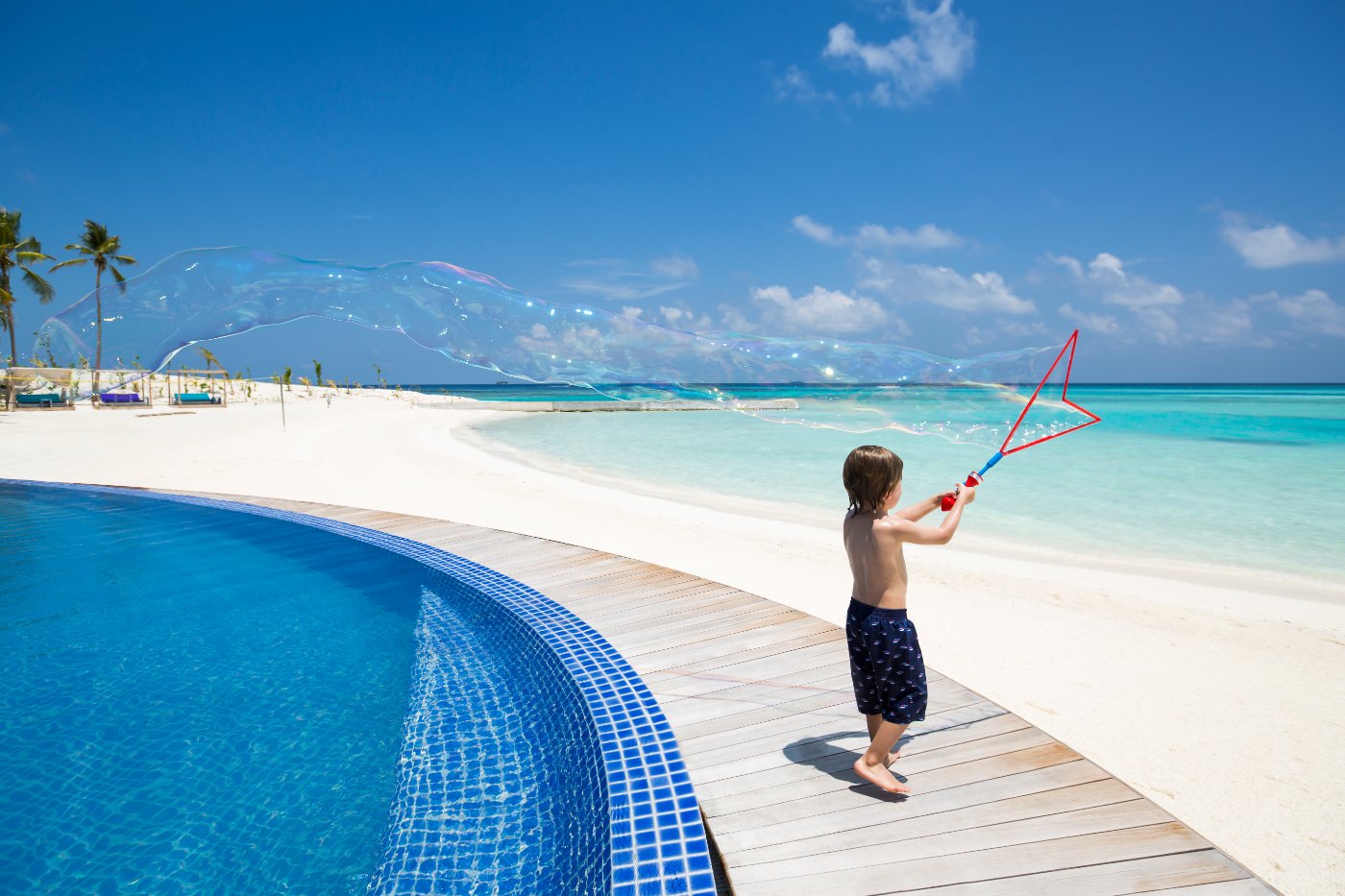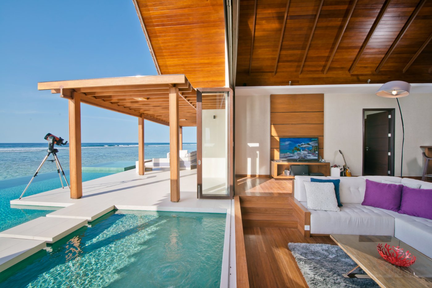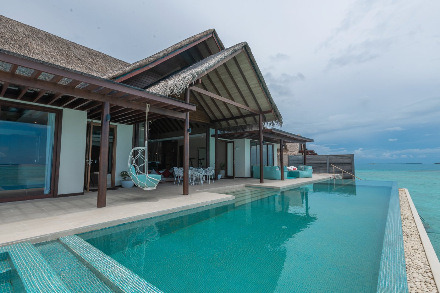 Painted with the colours of the ocean, and a private pool perched over the lagoon.